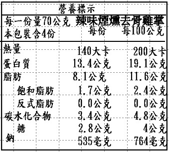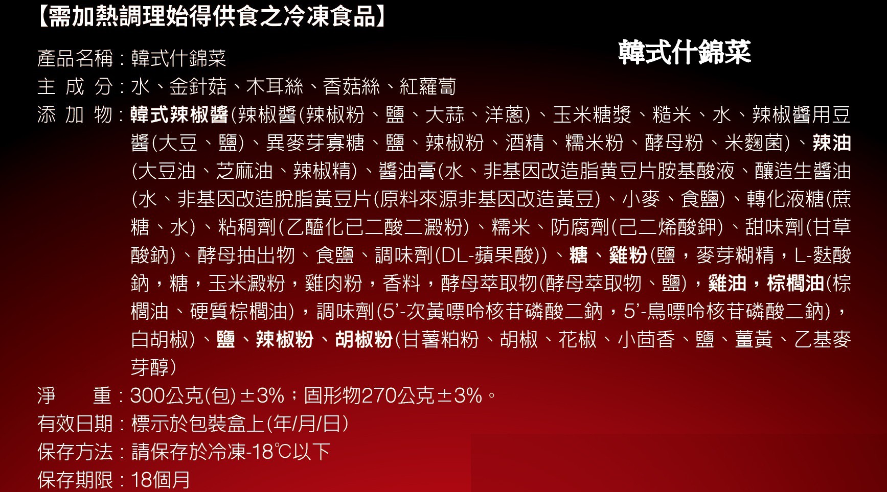 添加物 :韓式辣椒醬(辣椒醬(辣椒粉、鹽、大蒜、洋蔥)、玉米糖漿、糙米、水、辣椒醬用豆醬(大豆、鹽)、異麥芽寡糖、鹽、辣椒粉、酒精、糯米粉、酵母粉、米麹菌)、辣油(大豆油、芝麻油、辣椒精)、醬油膏(水、非基因改造脂黄豆片胺基酸液、釀造生醬油(水、非基因改造脫脂黃豆片(原料來源非基因改造黃豆)、小麥、食鹽)、轉化液糖(蔗糖、水)、粘稠劑(乙醯化已二酸二澱粉)、糯米、防腐劑(己二烯酸鉀)、甜味劑(甘草酸鈉)、酵母抽出物、食鹽、調味劑(DL-蘋果酸))、糖、雞粉(鹽,麥芽糊精,L-麩酸鈉,糖,玉米澱粉,雞肉粉,香料,酵母萃取物(酵母萃取物,鹽),雞油,棕櫚油(棕櫚油,硬質棕櫚油),調味劑(5′-次黃嘌呤核苷磷酸二鈉,5′-鳥嘌呤核苷磷酸二鈉),白胡椒)、鹽、辣椒粉、胡椒粉(甘薯粕粉、胡椒、花椒、小茴香、鹽、薑黃、乙基麥芽醇)