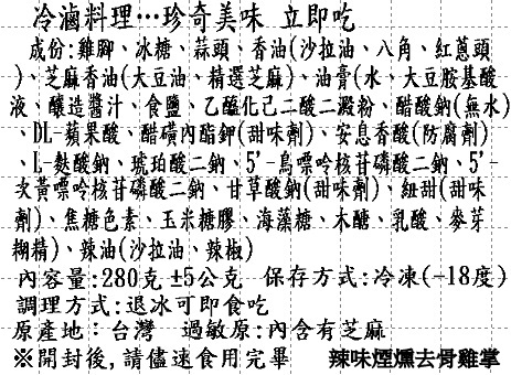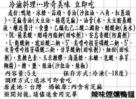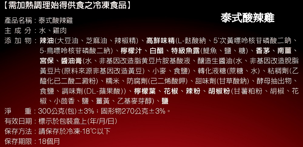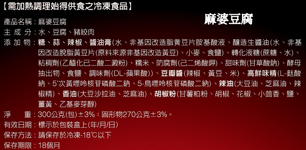添加物 : 糖、蒜、辣椒、 醬油膏(水、非基因改造脂黄豆片胺基酸液、釀造生醬油(水、非基因改造脫脂黃豆片(原料來源非基因改造黃豆)、小麥、食鹽)、轉化液糖(蔗糖、水)、粘稠劑(乙醯化已二酸二澱粉)、糯米、防腐劑(己二烯酸鉀)、甜味劑(甘草酸鈉)、酵母抽出物、食鹽、調味劑(DL-蘋果酸))、豆瓣醬(辣椒、黃豆、米)、高鮮味精(L-麩酸納、5’次黃嘌呤核苷磷酸二鈉、5-鳥嘌呤核苷磷酸二納)、辣油(大豆油、芝麻油、辣椒精)、香油(大豆沙拉油、芝麻油)、胡椒粉(甘薯粕粉、胡椒、花椒、小茴香、鹽、薑黃、乙基麥芽醇)
